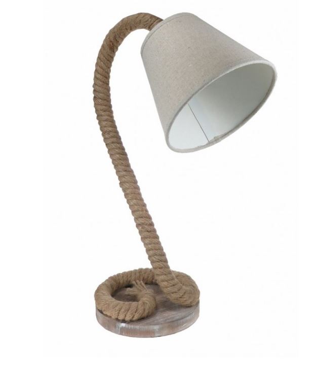 This Nautical Theme Desk Rope Lamp boasts a rustic wooden base adorned with a twisted rope, all complemented by a neutral-colored lampshade.