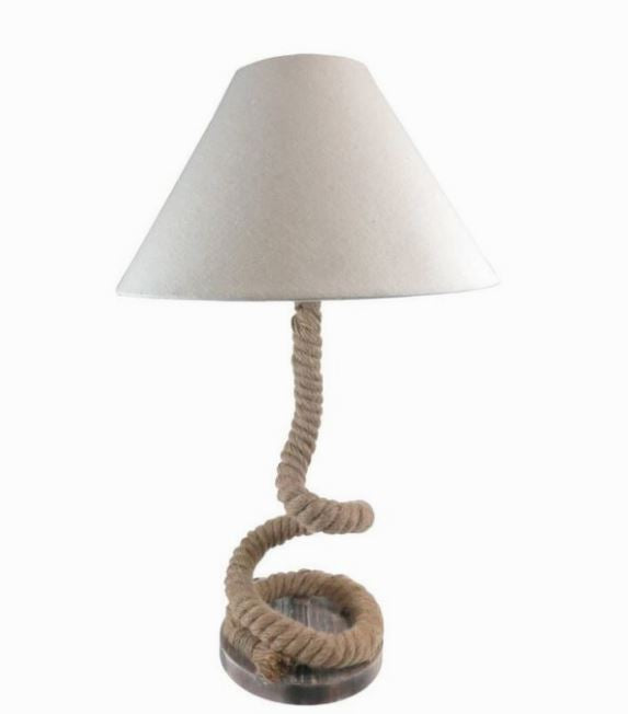 The Nautical Theme Twisted Rope Lamp showcases a unique design with its twisted rope detailing and rustic wooden base. A neutral-colored lampshade completes the look.