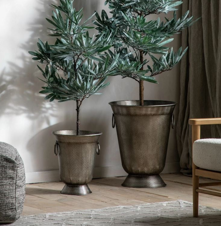 These antique gold finish planters feature a charming hammered texture, making them an ideal choice for adding decorative flair to your indoor area.