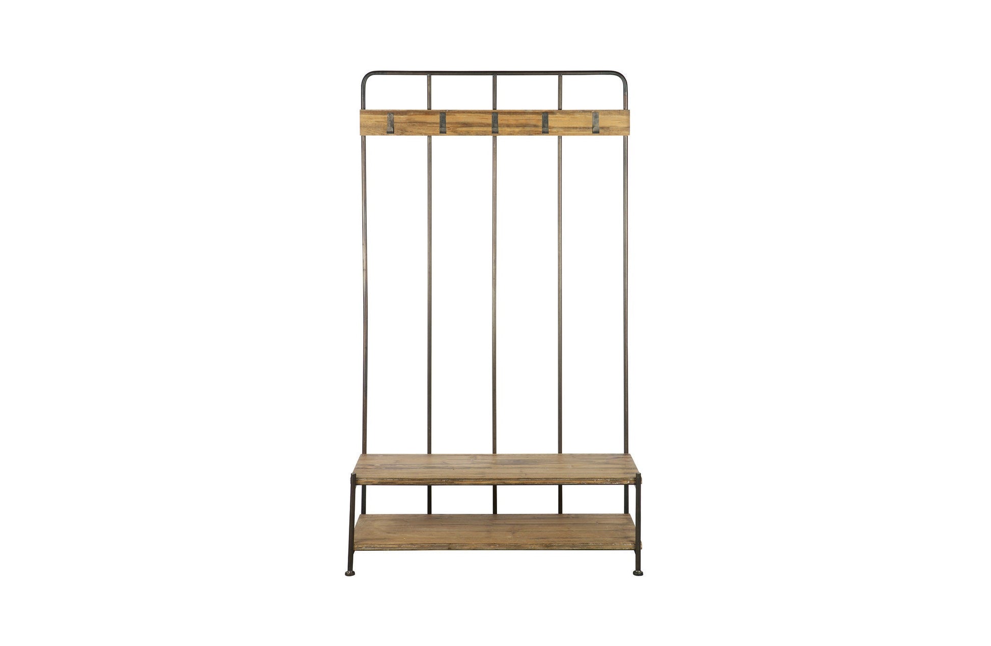 ✔ Este cabideiro autônomo tem cinco ganchos pendurados na parte superior e duas prateleiras grandes na parte inferior.