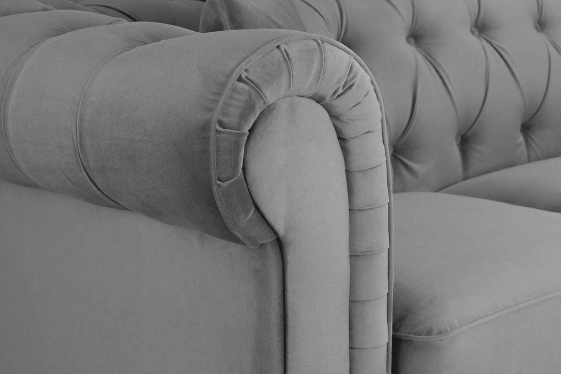Featuring scroll arms and button-tufted cushioning, all made complete with sculpted wooden feet and super soft plush velvet upholstery.