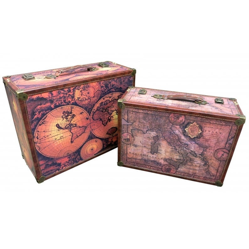 Map Wooden & Canvas Set of 2 Suitcases Trunks